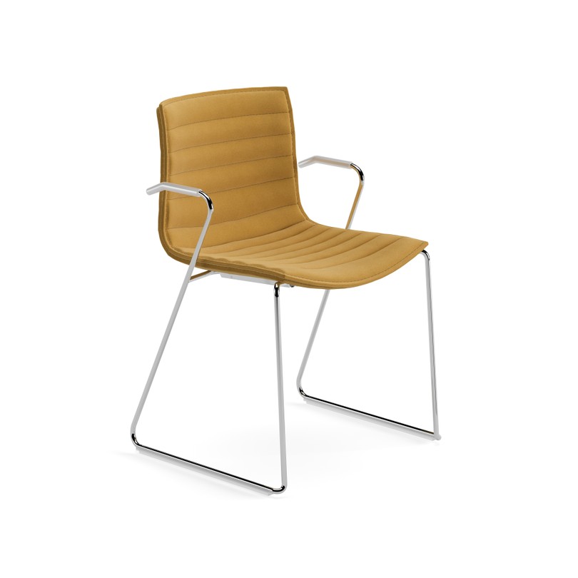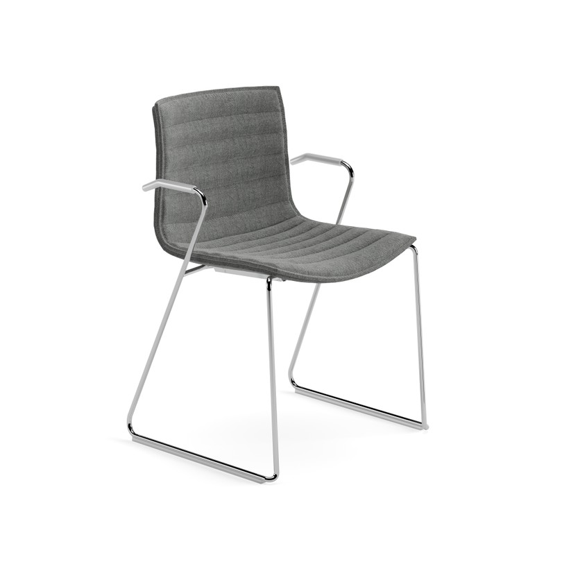 Asiento sobre estructura con patín de acero cromado con apoyabrazos. La carcasa es de polipropileno blanco (PO101) con fundas desmontable no lavable en tela, piel, tejidos recubiertos, tela o piel cliente ya puestas en la silla. La costura de la funda es a juego con el tapizado. Bajo pedido están disponible tacos para suelos de madera.