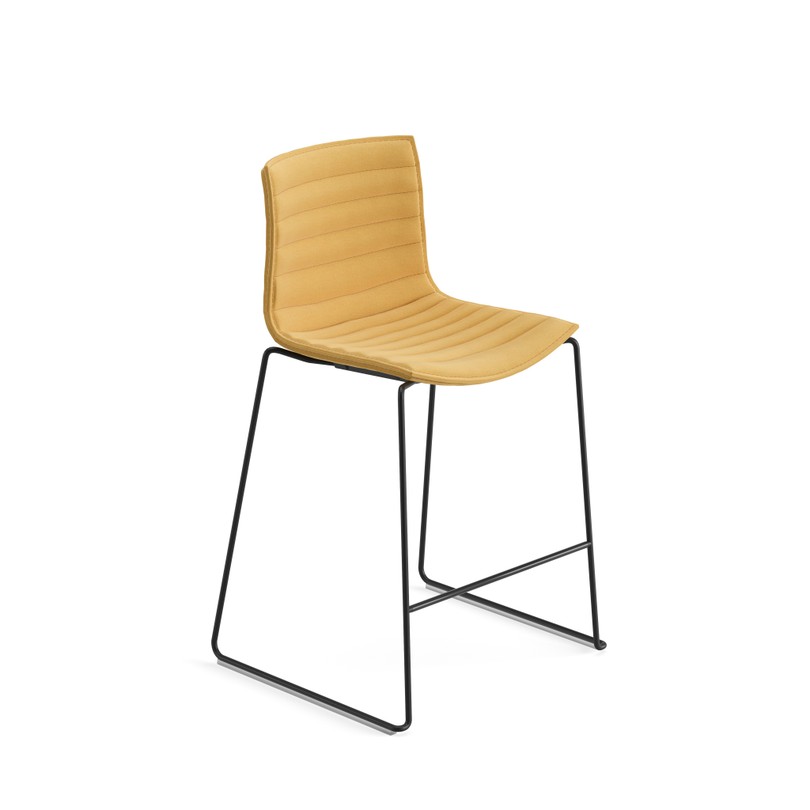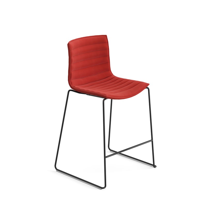 Taburete sobre estructura con patín de acero cromado o lacado y carcasa de polipropileno con funda desmontable no lavable en tela, piel, tejidos recubiertos, tela cliente o piel cliente ya puesta en la silla. La costura de la funda es a juego con el tapizado. Altura del asiento: 64 cm. Bajo pedido están disponibles tacos para suelos de madera.