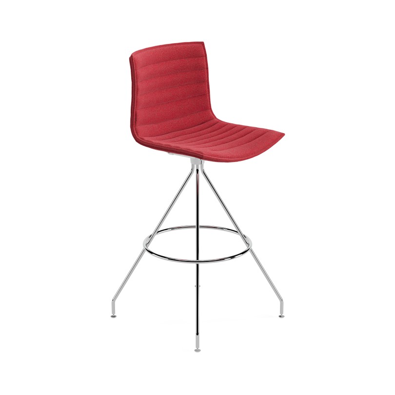 Taburete alto sobre estructura giratoria de acero cromado. La carcasa con respaldo alto de polipropileno blanco (PO101) con funda desmontable no lavable en tela, piel, tejidos recubiertos, tela o piel cliente ya puesta en la silla. La costura de la funda es a juego con el tapizado. Altura del asiento: 73 cm. Altura del respaldo: 108 cm.