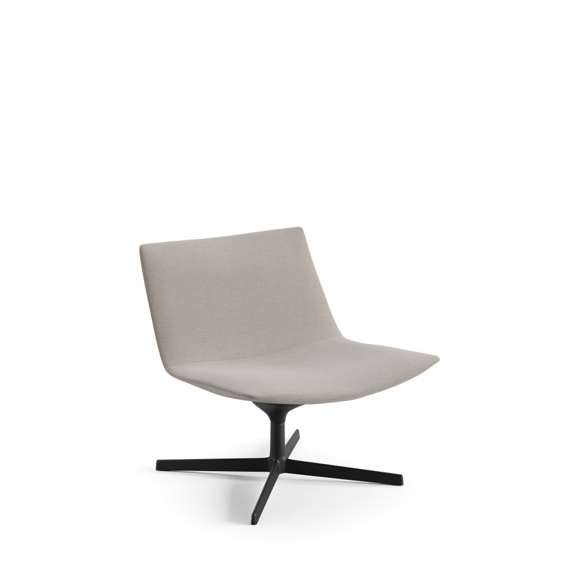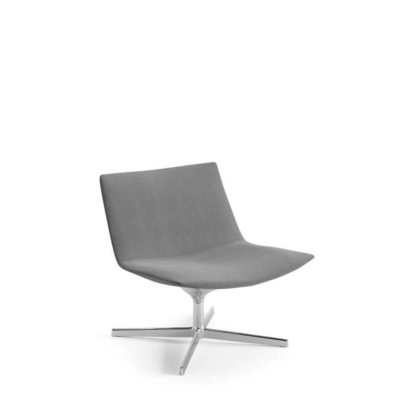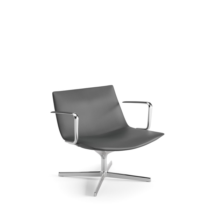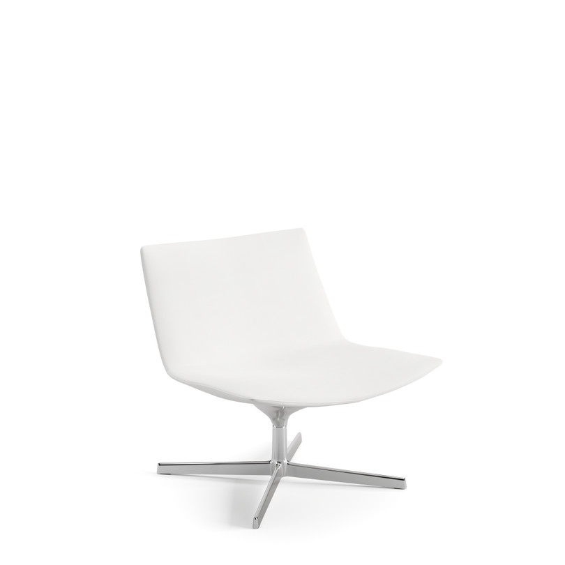 Chaise lounge avec structure centrale pivotante en aluminium poli ou peint. Coque en polyuréthane revêtue de tissu, cuir, tissu enduit, ou autre revêtement choisi par le client. Des accoudoirs en aluminium, dans la même finition que le piètement en version revêtue, sont disponibles en option.