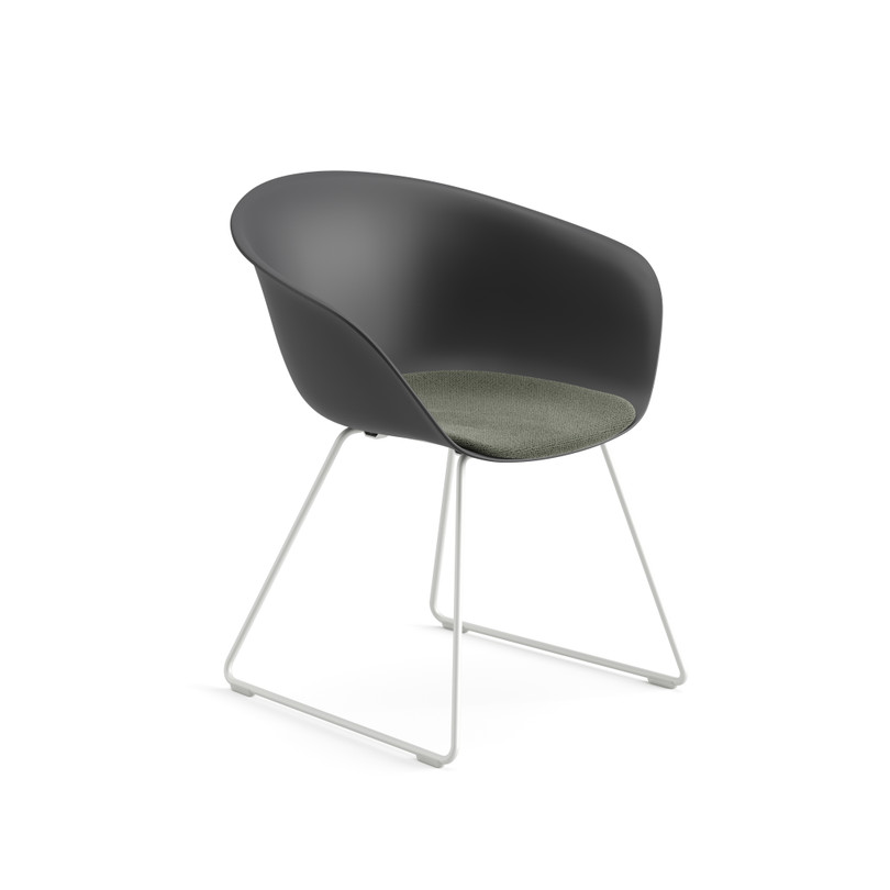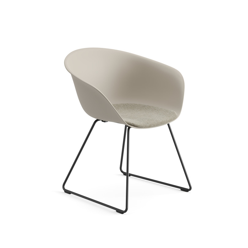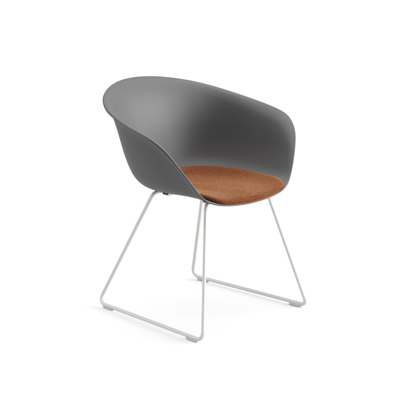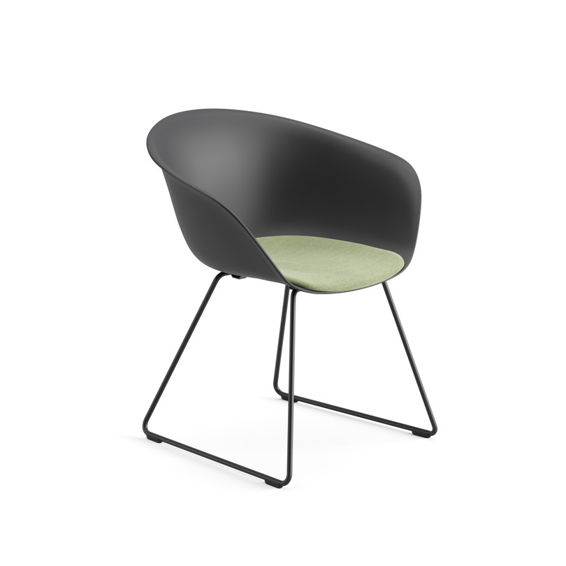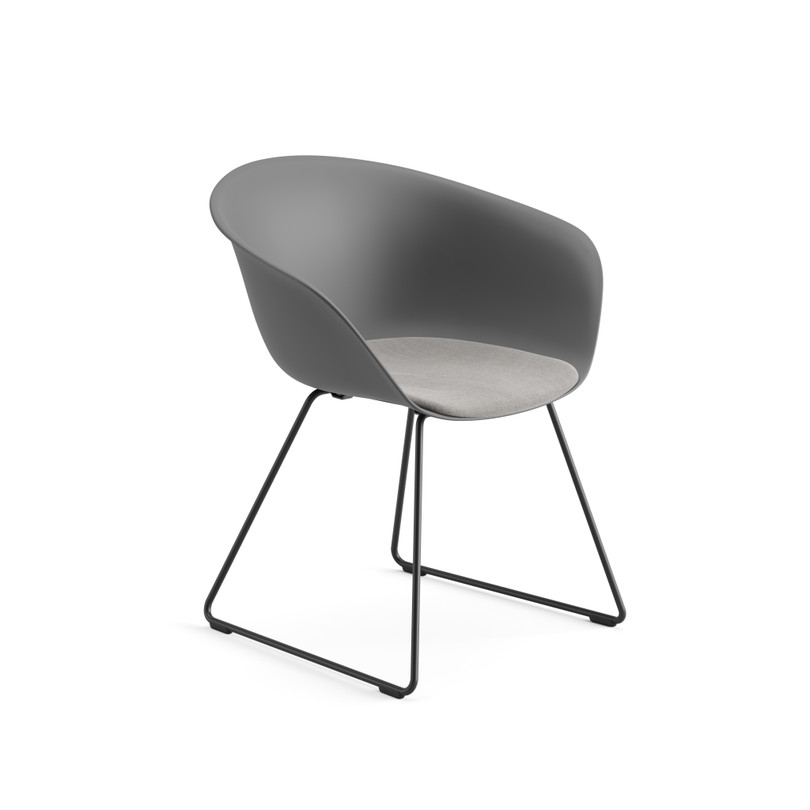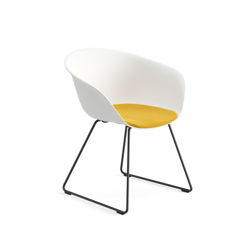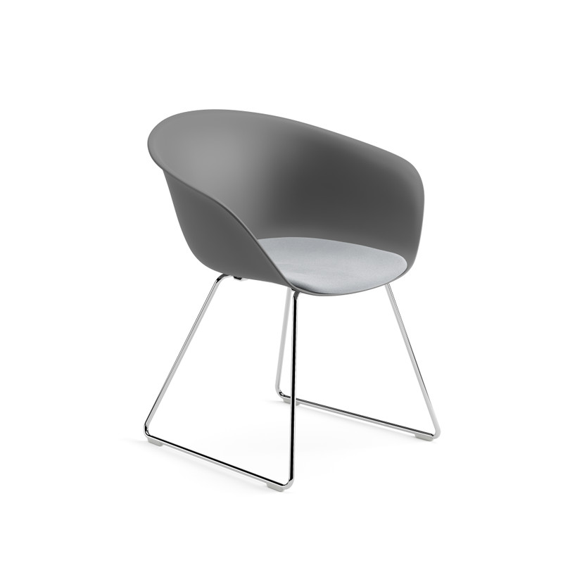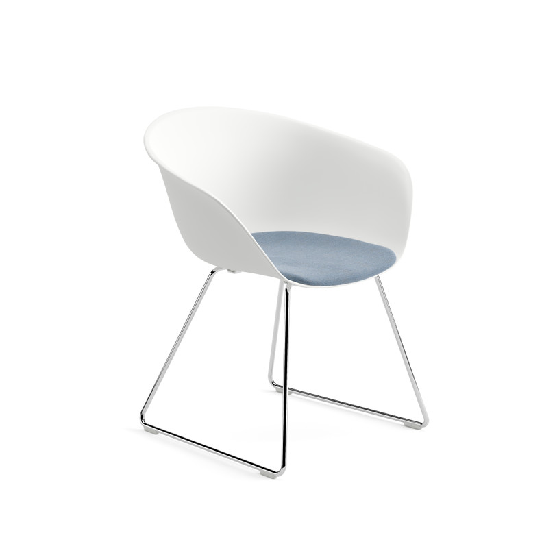Siège monté sur piètement luge en acier chromé ou laqué et coque en polypropylène disponible dans 4 couleurs et équipée d’un coussin appliqué à l’assise en cuir, tissus enduits, tissu, tissu client ou cuir client.