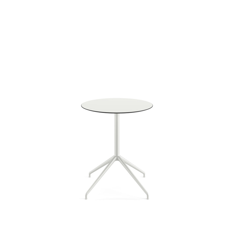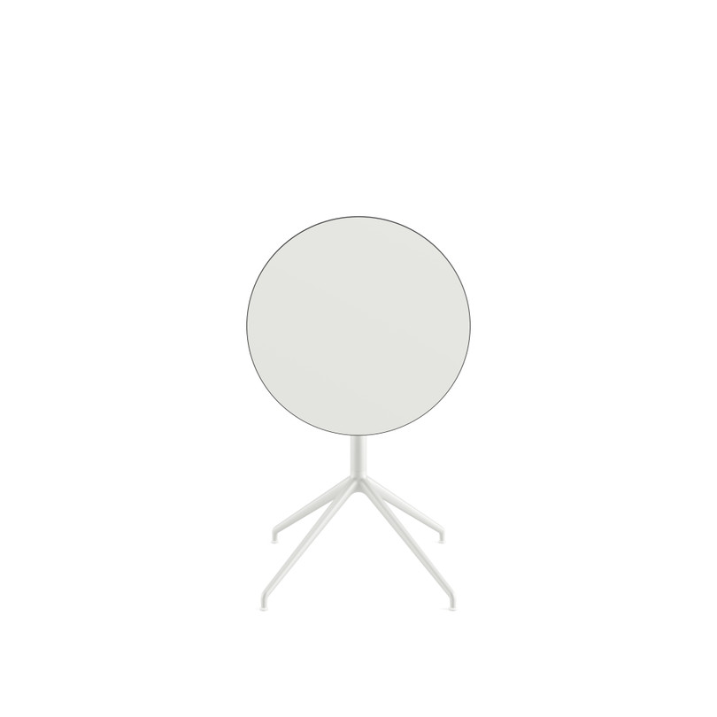 Tavolo rotondo con struttura in alluminio verniciato, dotata di piedini regolabili. Piano Ø 59 cm in Compact HPL (spessore 1 cm). Disponibile in versione fissa o con meccanismo flipping. Altezza 72,5 cm.