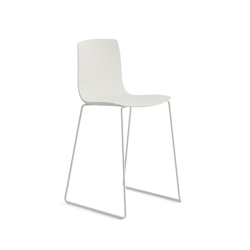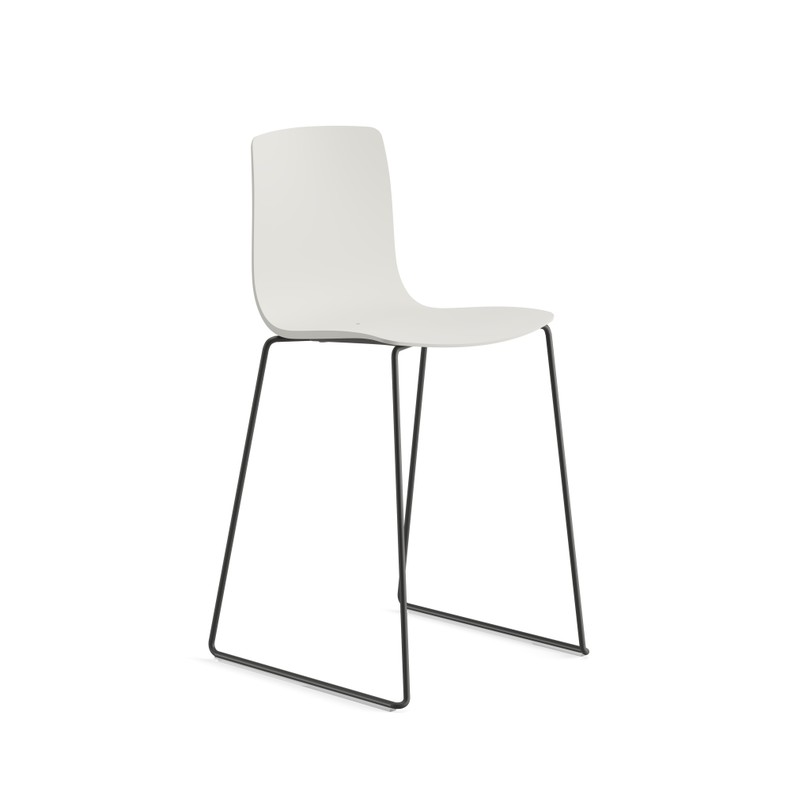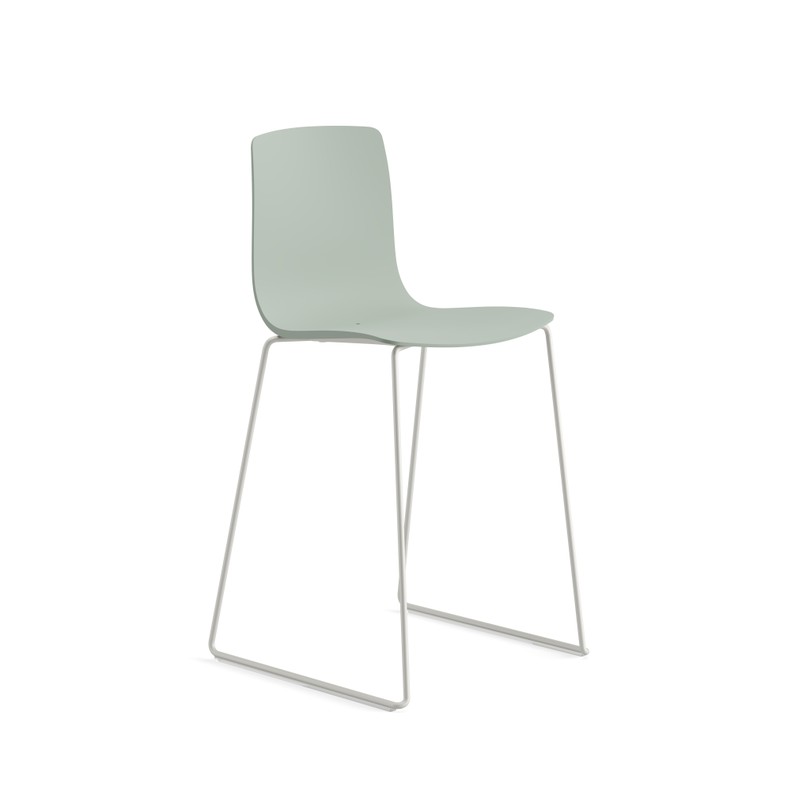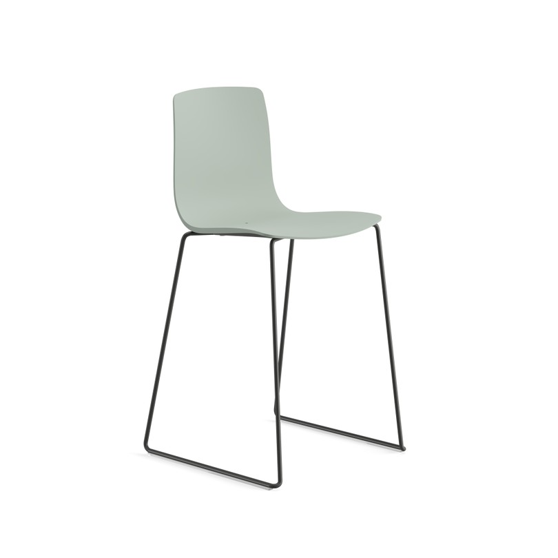 Stool on a sled base in powder-coated steel. Shell in polypropylene made with post-consumer recycled materials, mixed with virgin material, available in 5 colours. Seat height 25 5/8''. Version suitable for outdoor use.